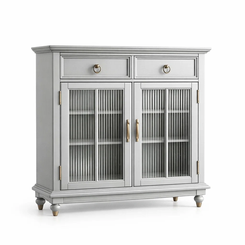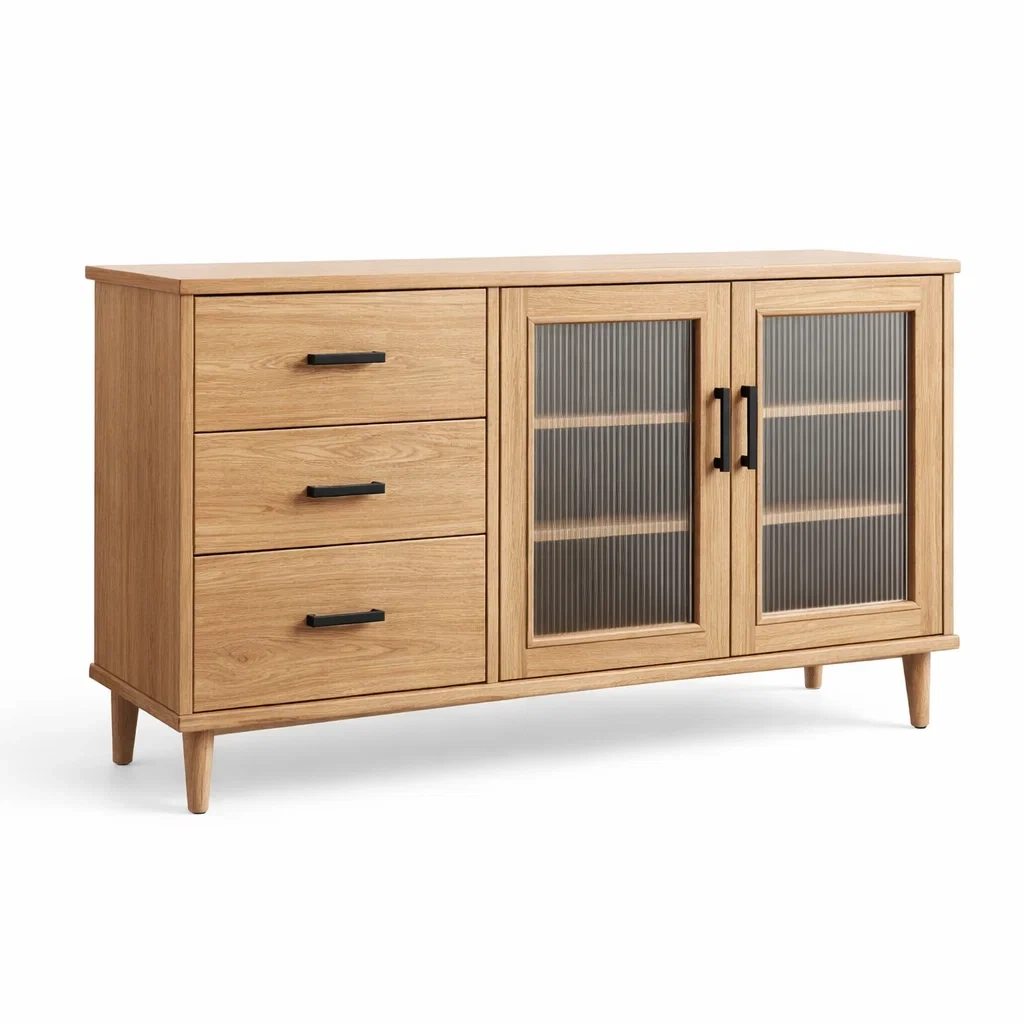 Buffet en bois avec portes en verre strié et tiroirs