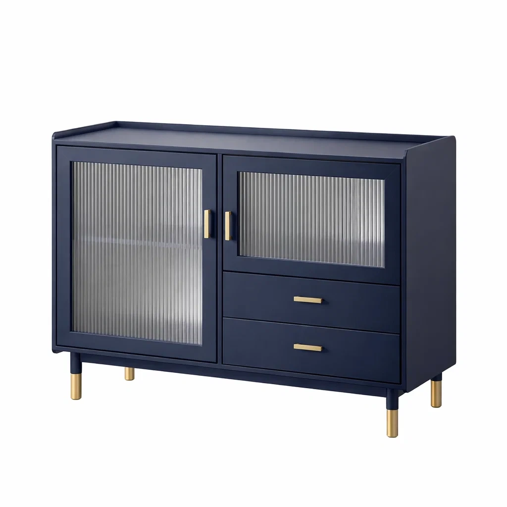 Buffet en bois bleu avec portes en verre cannelé et tiroirs