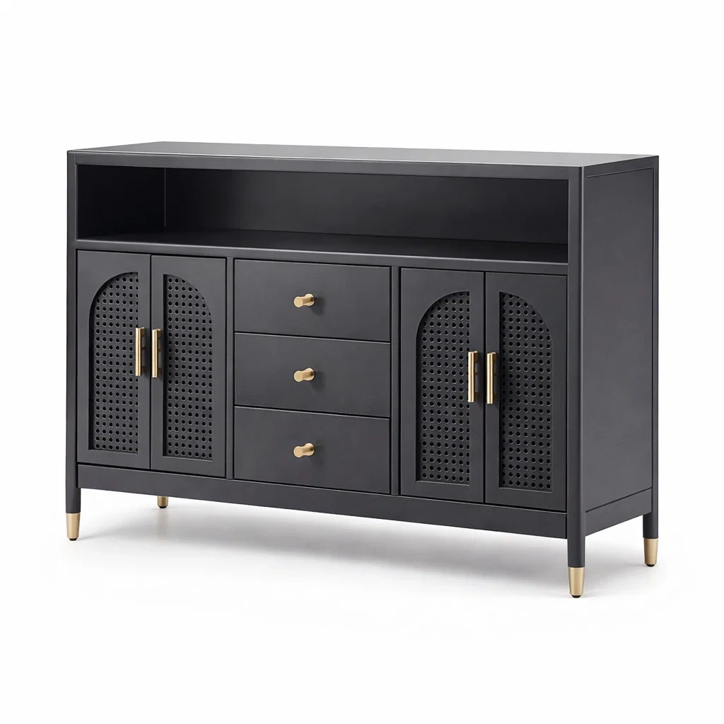 Buffet en bois noir avec portes en rotin et 3 tiroirs