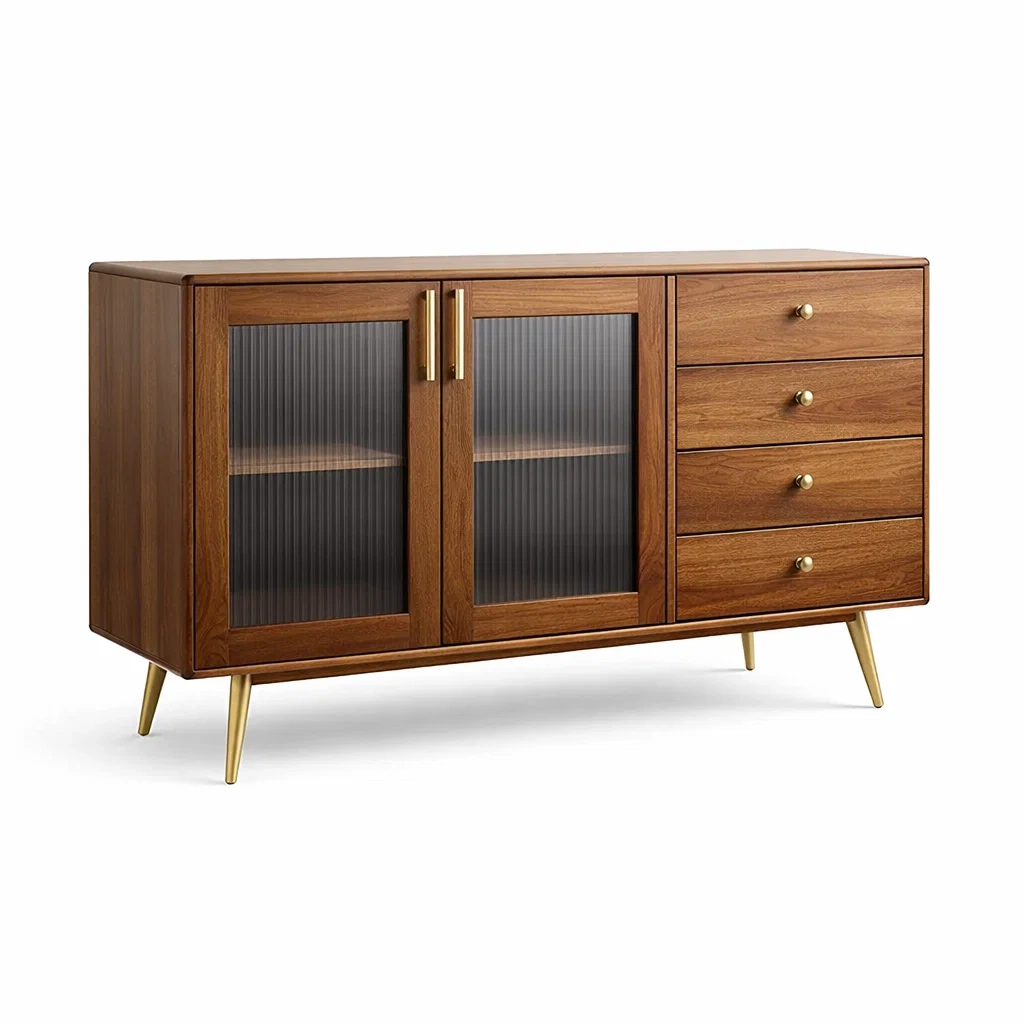 Buffet en bois de noyer avec verre nervuré et pieds métalliques