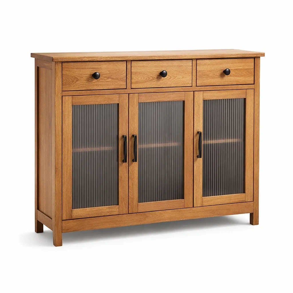 Buffet en bois de chêne avec portes en verre cannelé et 3 tiroirs