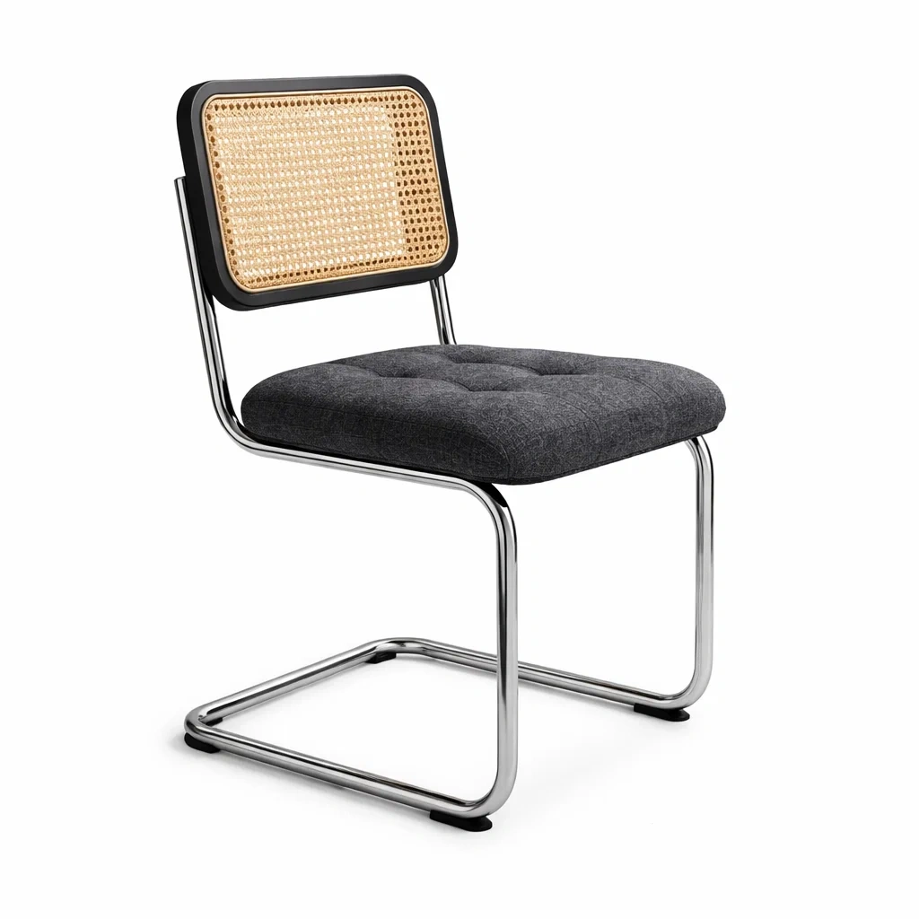 Chaise de salle à manger en acier inoxydable avec assise en tissu et dossier en rotin