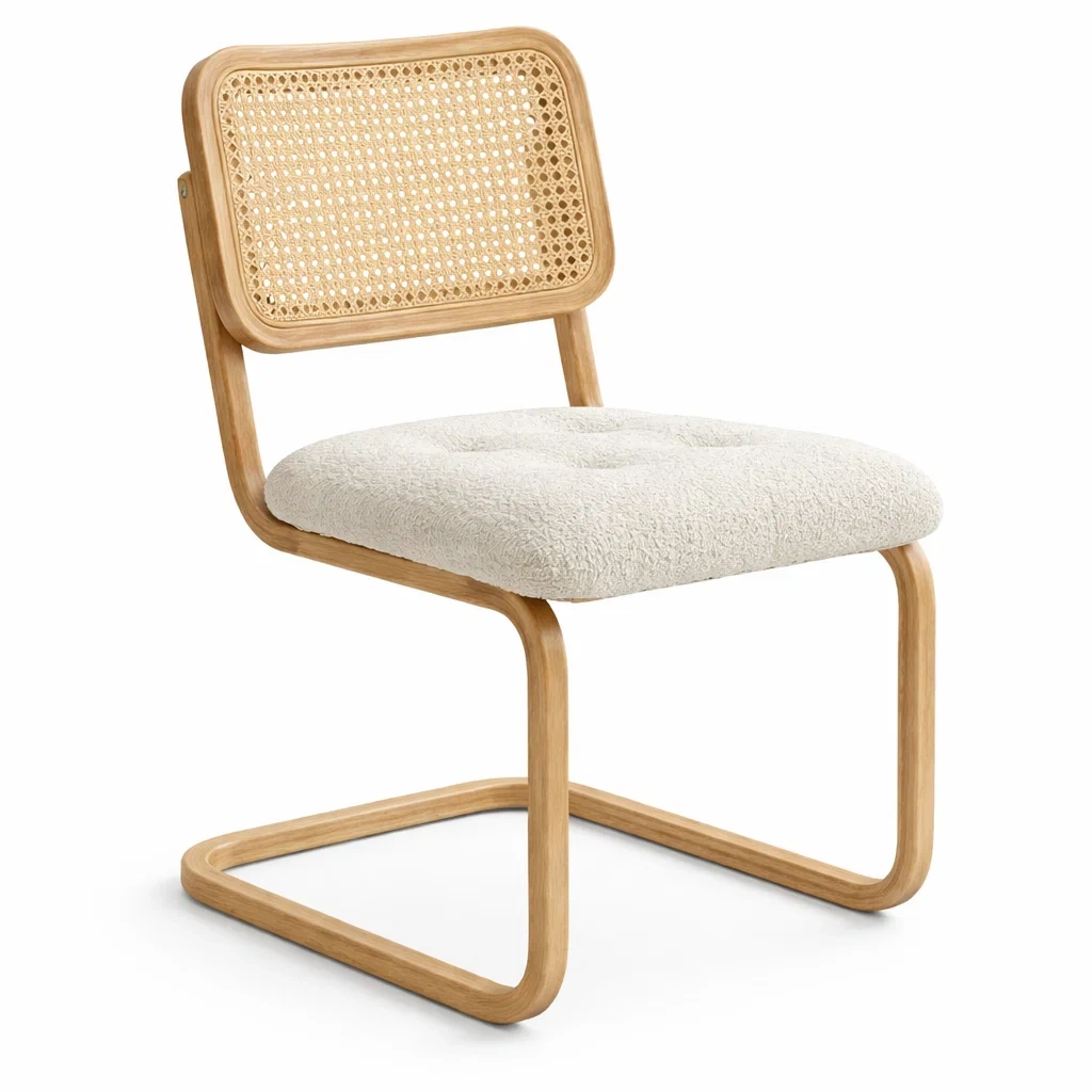 Chaise de salle à manger en bois avec dossier en cannage et assise en tissu bouclé beige