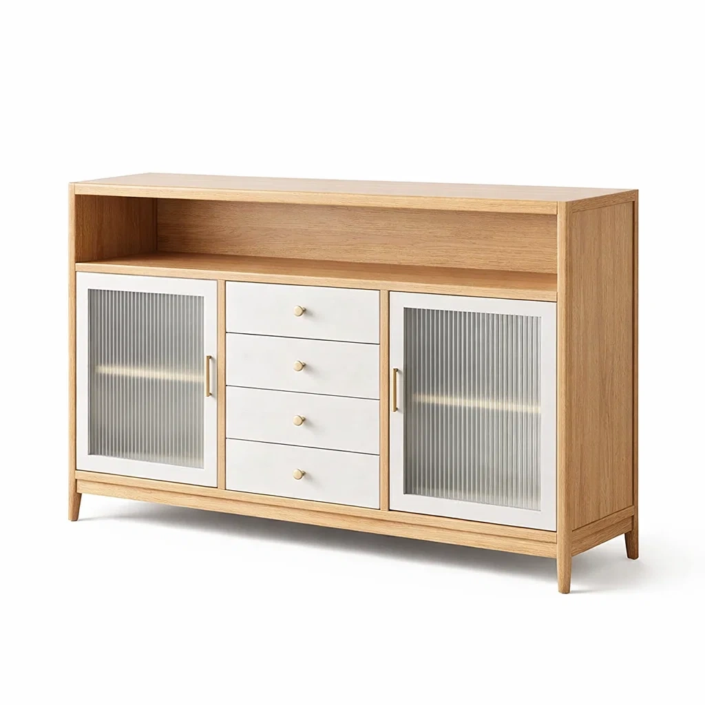 Structure: Comprend 4 tiroirs et 2 portes avec une étagère supérieure ouverte.