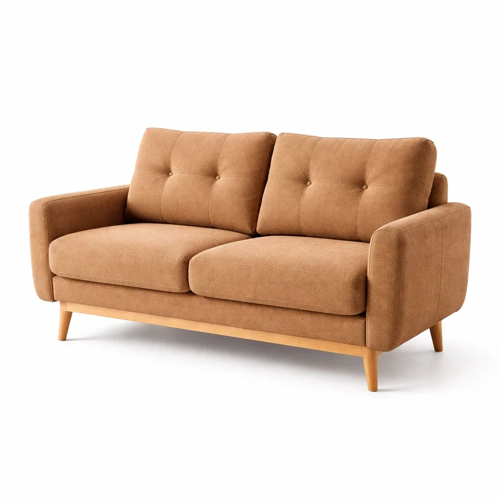 Ce canapé 2 places est fabriqué avec une structure en bois massif et un revêtement en tissu 100% polyester résistant. Les coussins sont en mousse de polyuréthane. Les pieds en bois surélevés facilitent le nettoyage. Le dossier est orné de boutons.