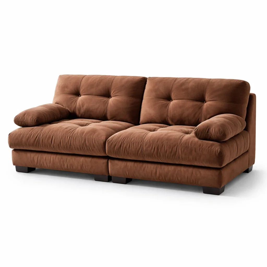 Ce canapé 2 places est recouvert de tissu en microfibre marron, offrant une texture douce. Le rembourrage est en mousse de polyester. Sa structure est composée de deux modules fixés par des crochets métalliques.