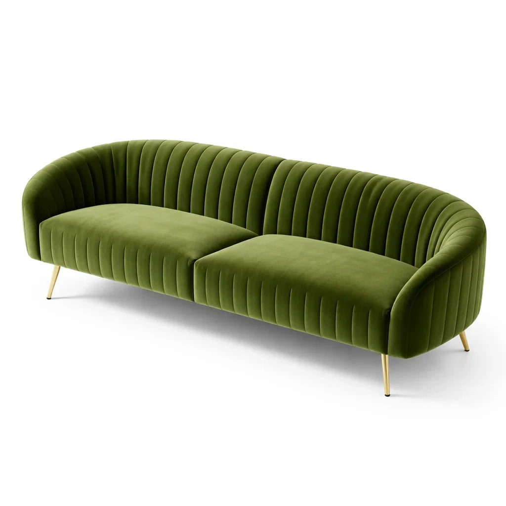 Ce canapé est fabriqué avec un revêtement en velours et des pieds en métal.
