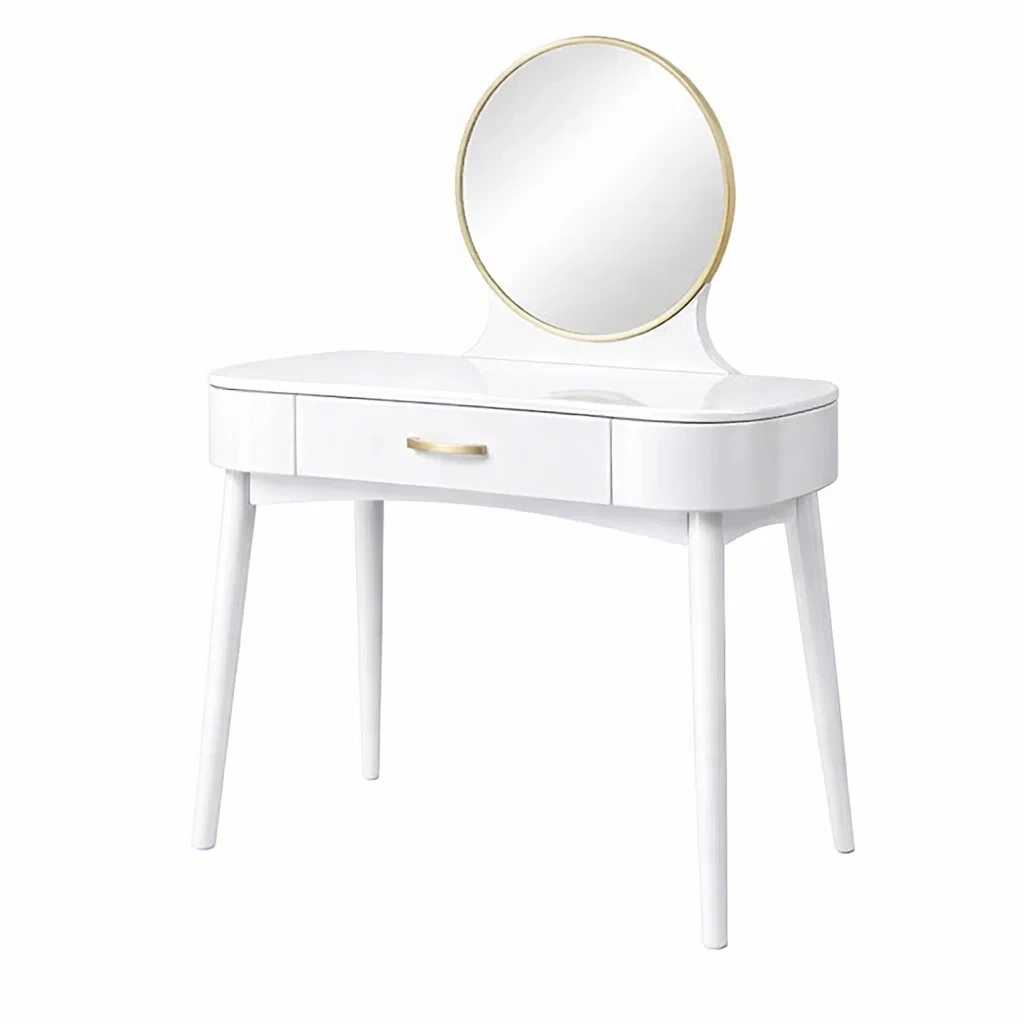 Cette coiffeuse est fabriquée en bois laqué avec une finition vernie. Elle dispose d'un miroir rond avec un cadre en métal doré. Le tiroir offre un espace de rangement pratique. Dimensions : hauteur 136 cm, largeur 80 cm, profondeur 40 cm. Poids de 17 kg.