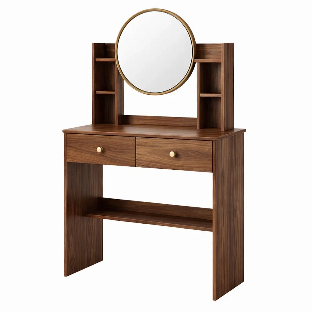 Coiffeuse en bois de noyer avec miroir rond et étagères