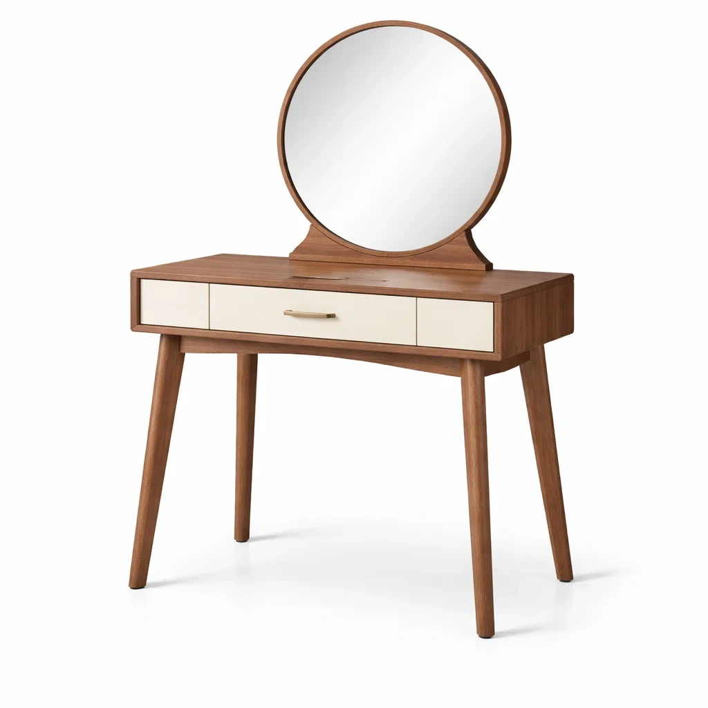Coiffeuse en bois de noyer avec miroir rond et tiroirs beige