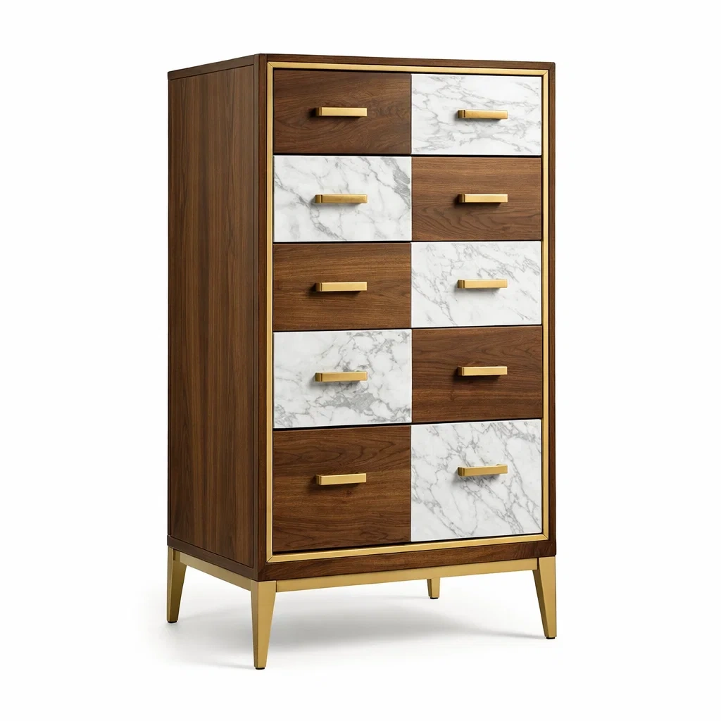 Matériaux décoratifs : Façades des tiroirs en motifs marbre avec poignées en métal doré