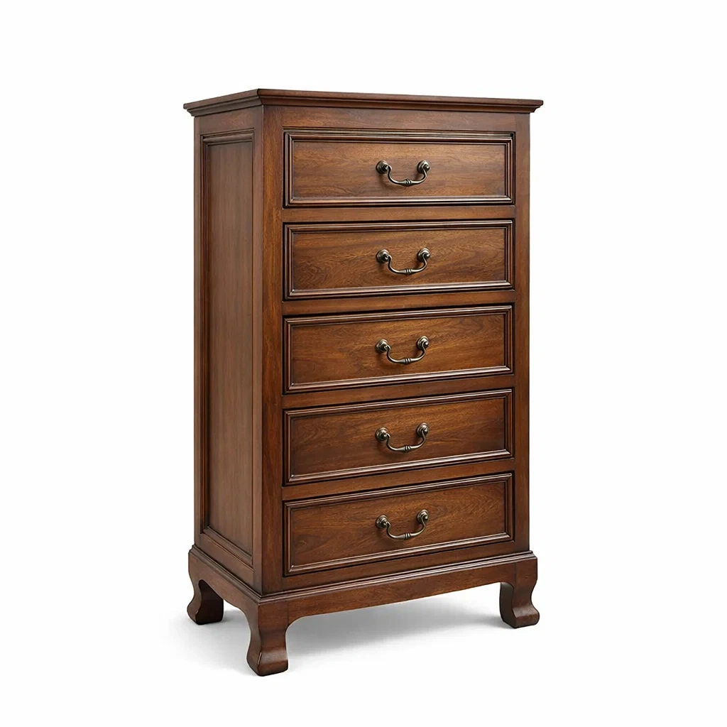 Commode fabriquée en bois massif brun avec finition vernie.