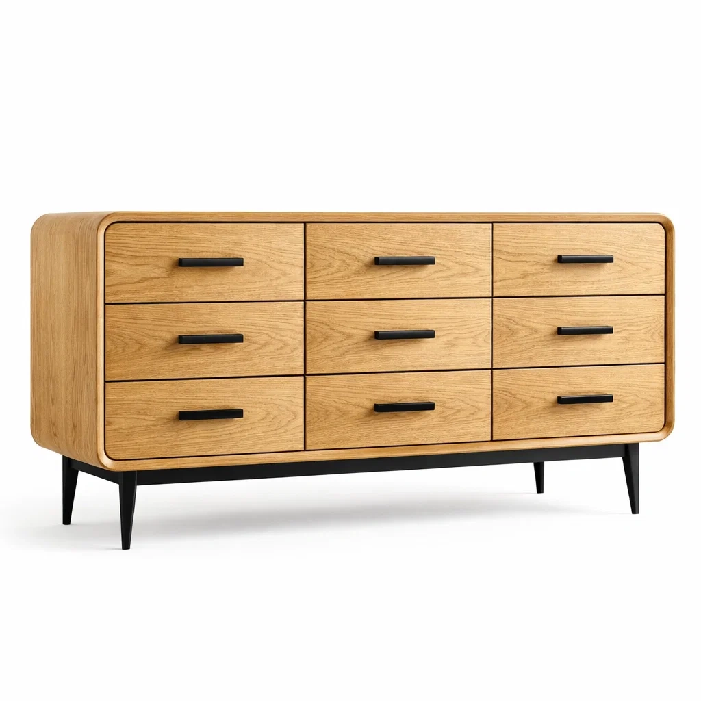 Commode en chêne massif avec 9 tiroirs et pieds en métal noir