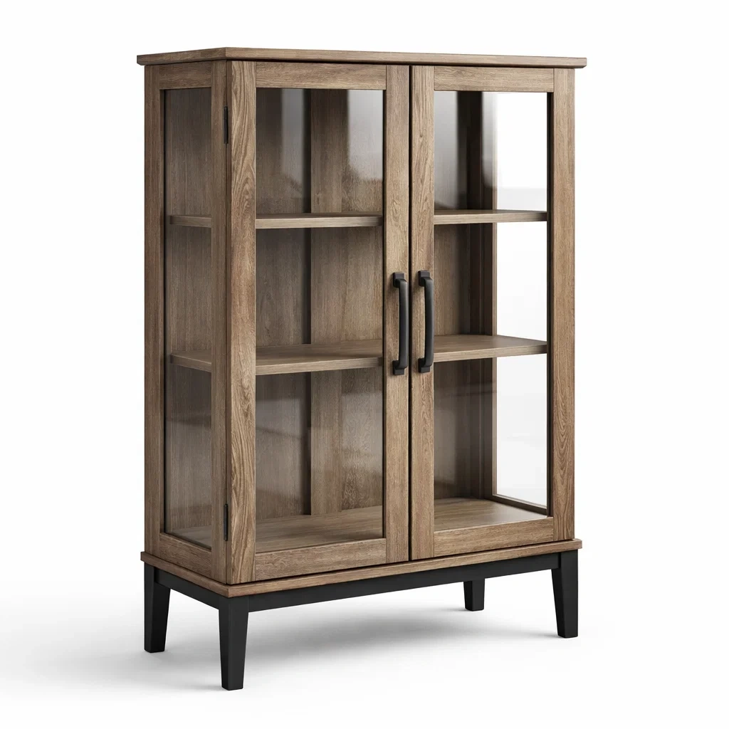 Caractéristiques: Portes vitrées, 3 étagères en bois, poignées en métal noir